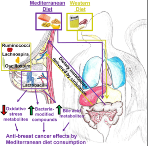 The team found that, in primates, eating a Mediterranean diet altered composition of the breast tissue microbiome + associated microbial metabolites in the region. The findings suggest that dietary changes may influence microbiome ecosystems outside the human gut.